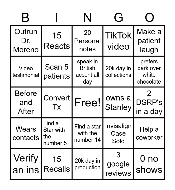 This bingo card has a free space and 24 words: Find a Star with the number 5, 15 Recalls, speak in British accent all day, Verify an ins, Make a patient laugh, Outrun Dr. Moreno, Video testimonial, 15 Reacts, owns a Stanley, Find a star with the number 14, 20k day in collections, Before and After, Invisalign Case Sold, Help a coworker, Scan 5 patients, 3 google reviews, 2 DSRP's in a day, 20 Personal notes, prefers dark over white chocolate, Convert Tx, 0 no shows, Wears contacts, TikTok video and 20k day in production.