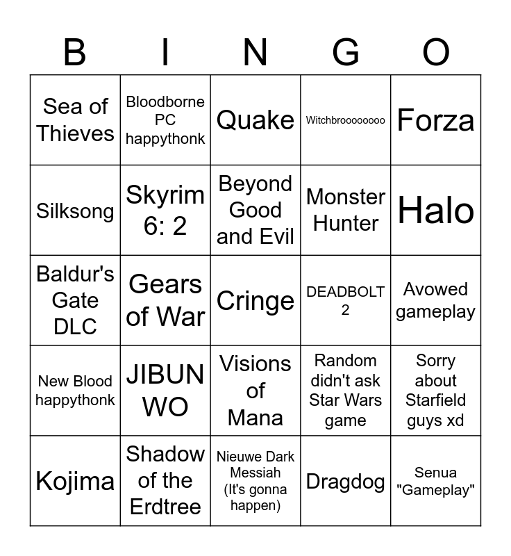 This bingo card has a free space and 24 words: JIBUN WO, Shadow of the Erdtree, Beyond Good and Evil, Kojima, Forza, Sea of Thieves, Silksong, Bloodborne PC happythonk, DEADBOLT 2, Visions of Mana, Monster Hunter, Baldur's Gate DLC, Random didn't ask Star Wars game, Sorry about Starfield guys xd, Skyrim 6: 2, Dragdog, Avowed gameplay, Quake, Halo, Gears of War, Senua "Gameplay", New Blood happythonk, Witchbroooooooo and Nieuwe Dark Messiah (It's gonna happen).