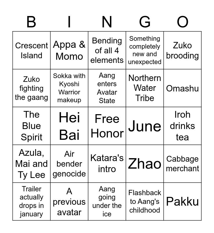 This bingo card has a free space and 24 words: Air bender genocide, A previous avatar, Aang enters Avatar State, Trailer actually drops in january, Zuko brooding, Crescent Island, Zuko fighting the gaang, Appa & Momo, June, Katara's intro, Northern Water Tribe, The Blue Spirit, Zhao, Cabbage merchant, Sokka with Kyoshi Warrior makeup, Flashback to Aang's childhood, Iroh drinks tea, Bending of all 4 elements, Omashu, Hei Bai, Pakku, Azula, Mai and Ty Lee, Something completely new and unexpected and Aang going under the ice.