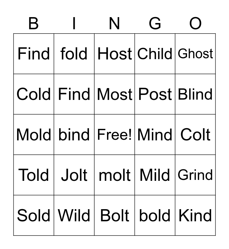 This bingo card has a free space and 27 words: Mild, Scold, Post, Bolt, Cold, Host, fold, Told, Mind, Grind, Mold, Child, Sold, Wild, Blind, Gold, Find, Most, Jolt, Find, Colt, bold, bind, Kind, molt, Ghost and Rind.
