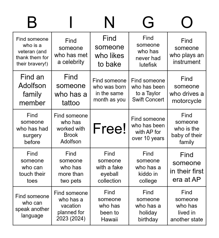 This bingo card has a free space and 34 words: Find someone with zero cavities, Find someone who has a holiday birthday, Find someone who knows a twin (has a twin?), Find someone who has visited another country, Find someone who can touch their toes, Find someone who has a tattoo, Find someone who plays an instrument, Find someone who can speak another language, Find someone who has met a celebrity, Find someone who likes pineapple on pizza, Find someone who was born in the same month as you, Find someone who likes to bake, Find someone who likes karaoke, Find someone who is left-handed, Find someone who has been with AP for over 10 years, Find someone who drives a motorcycle, Find someone who has a vacation planned for 2023 (2024), Find someone who has had surgery before, Find someone who has more than two pets, Find someone who has a kiddo in college, Find someone with a fake eyeball collection, Find someone who has a vintage car, Find someone who is a veteran (and thank them for their bravery!), Find someone who is the baby of their family, Find someone who has been to Hawaii, Find someone who has lived in another state, Find someone who has never had lutefisk, Find someone who has gone skiing this winter, Find someone who has been to a Taylor Swift Concert, Find an Adolfson family member, Find someone who is “22” (from Taylor song-not sure how many 22 yr olds there will be), Find someone who has worked with Brook Adolfson, Find someone in their first era at AP and Find someone wearing a friendship bracelet.