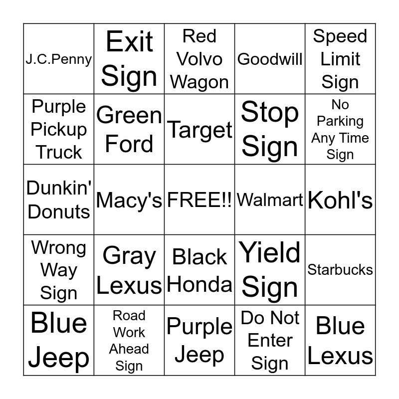 This bingo card has a free space and 24 words: Gray Lexus, Road Work Ahead Sign, Target, Blue Jeep, Speed Limit Sign, J.C.Penny, Purple Pickup Truck, Exit Sign, Walmart, Black Honda, Stop Sign, Dunkin' Donuts, Yield Sign, Starbucks, Green Ford, Do Not Enter Sign, Kohl's, Red Volvo Wagon, No Parking Any Time Sign, Macy's, Blue Lexus, Wrong Way Sign, Goodwill and Purple Jeep.