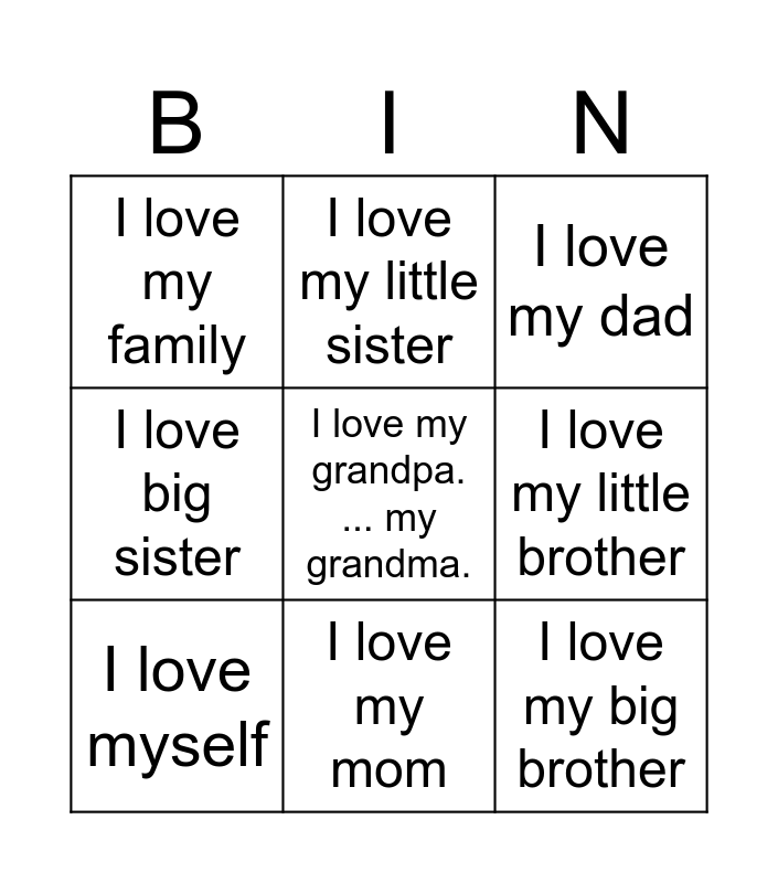 This bingo card has a free space and 8 words: I love my little brother, I love my dad, I love my little sister, I love myself, I love my family, I love my big brother, I love big sister and I love my mom.
