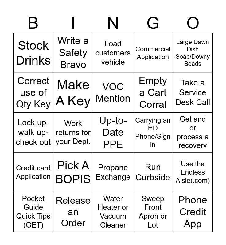 This bingo card has 25 words: Pick A BOPIS, Water Heater or Vacuum Cleaner, VOC Mention, Pocket Guide Quick Tips (GET), Large Dawn Dish Soap/Downy Beads, Stock Drinks, Correct use of Qty Key, Write a Safety Bravo, Carrying an HD Phone/Sign in, Propane Exchange, Empty a Cart Corral, Lock up-walk up-check out, Run Curbside, Use the Endless Aisle(.com), Make A Key, Phone Credit App, Get and or process a recovery, Load customers vehicle, Take a Service Desk Call, Work returns for your Dept., Up-to-Date PPE, Release an Order, Credit card Application, Commercial Application and Sweep Front Apron or Lot.