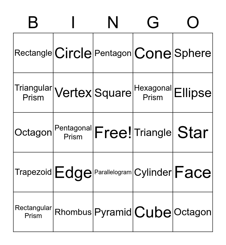 This bingo card has a free space and 24 words: Edge, Rhombus, Square, Rectangular Prism, Sphere, Rectangle, Triangular Prism, Circle, Triangle, Parallelogram, Hexagonal Prism, Octagon, Cylinder, Face, Vertex, Cube, Star, Pentagon, Ellipse, Pentagonal Prism, Octagon, Trapezoid, Cone and Pyramid.