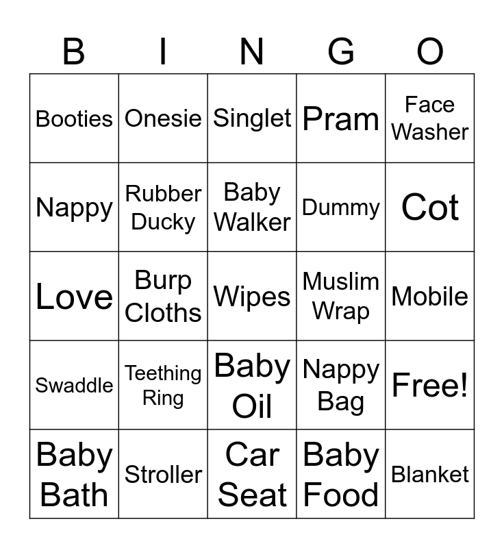 This bingo card has 28 words: Free!, Bottle, Dummy, Baby Food, Nappy, Singlet, Onesie, Swaddle, Muslim Wrap, Baby Bath, Love, Pram, Stroller, Car Seat, Cot, Bassinet, Teething Ring, Rubber Ducky, Baby Walker, Baby Oil, Booties, Blanket, Wipes, Burp Cloths, Mobile, Nappy Bag, Face Washer and Hooded Towel.