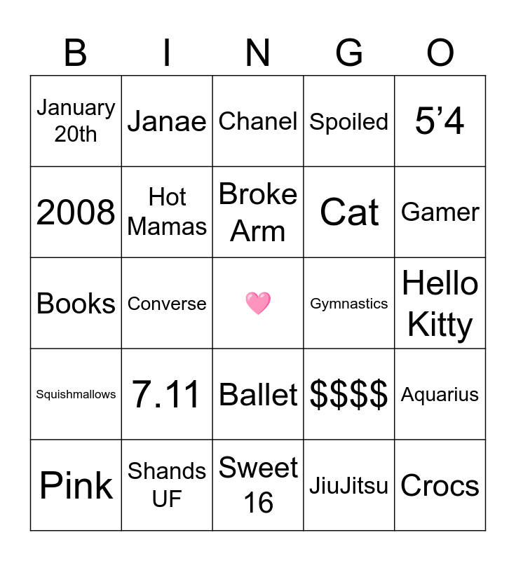 This bingo card has a free space and 24 words: 7.11, Shands UF, Broke Arm, Pink, 5’4, January 20th, 2008, Janae, Gymnastics, Ballet, Cat, Books, $$$$, Aquarius, Hot Mamas, JiuJitsu, Hello Kitty, Chanel, Gamer, Converse, Crocs, Squishmallows, Spoiled and Sweet 16.