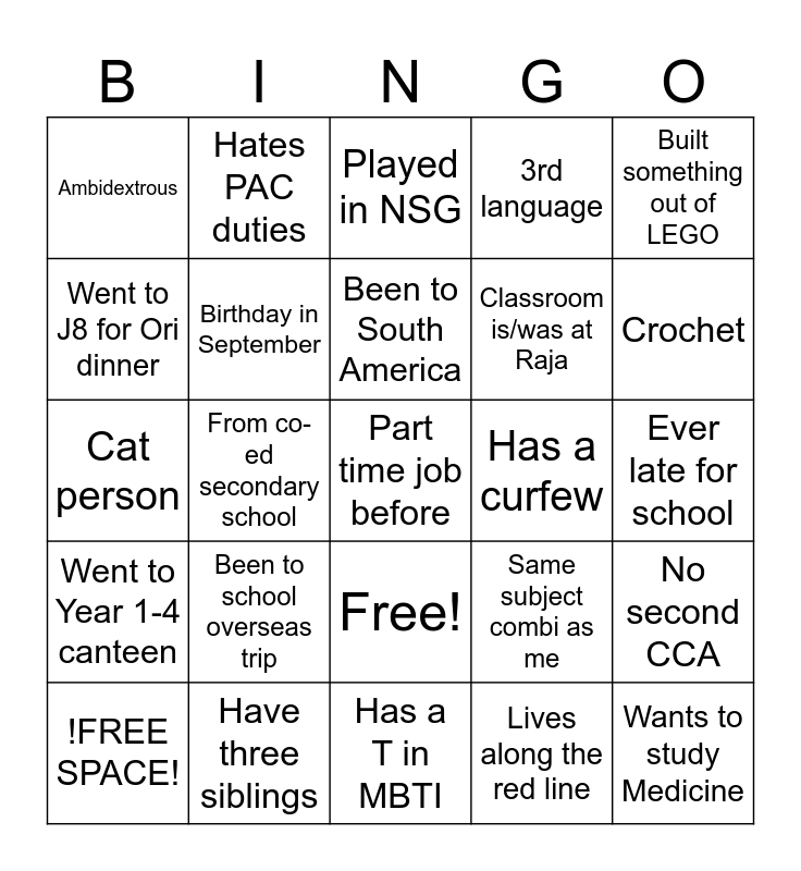 This bingo card has 26 words: Free!, Lives along the red line, Been to South America, Have three siblings, Built something out of LEGO, Ambidextrous, Went to J8 for Ori dinner, Hates PAC duties, Ever late for school, Same subject combi as me, Classroom is/was at Raja, Cat person, No second CCA, !FREE SPACE!, From co-ed secondary school, Plays an instrument, 3rd language, Went to Year 1-4 canteen, Played in NSG, Part time job before, Crochet, Has a T in MBTI, Has a curfew, Been to school overseas trip, Birthday in September and Wants to study Medicine.