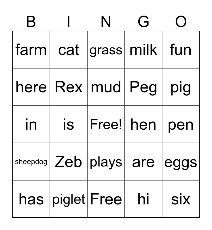This bingo card has a free space and 24 words: Zeb, piglet, mud, has, fun, farm, here, cat, hen, plays, Peg, in, are, eggs, Rex, hi, pen, grass, pig, is, six, sheepdog, milk and Free.