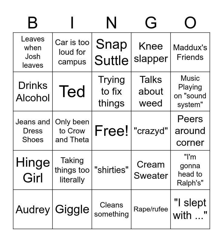 This bingo card has a free space and 24 words: Taking things too literally, Giggle, Trying to fix things, Audrey, Maddux's Friends, Leaves when Josh leaves, Drinks Alcohol, Car is too loud for campus, "crazyd", "shirties", Talks about weed, Jeans and Dress Shoes, Cream Sweater, "I'm gonna head to Ralph's", Ted, Rape/rufee, Peers around corner, Snap Suttle, Music Playing on "sound system", Only been to Crow and Theta, "I slept with ...", Hinge Girl, Knee slapper and Cleans something.