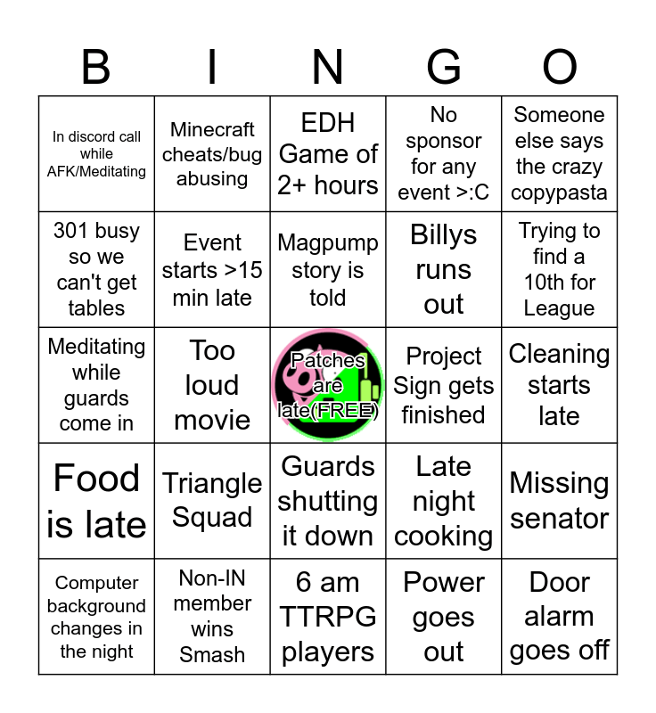 This bingo card has a free space and 32 words: Power goes out, Someone screams during opening ceremony, Too loud movie, Server issues, Food is late, Event starts >15 min late, Someone else says the crazy copypasta, Missing senator, Minecraft cheats/bug abusing, SOOT is late, Magpump story is told, EDH Game of 2+ hours, Random draft in the middle of the LAN, SK Complains about no Hallonsoda, Project Sign gets finished, Someone gets beaned, Computer background changes in the night, Meditating while guards come in, Guards shutting it down, Triangle Squad, Late night cooking, Magic event takes too long, Cleaning starts late, Non-IN member wins Smash, Door alarm goes off, No sponsor for any event >:C, Billys runs out, 301 busy so we can't get tables, In discord call while AFK/Meditating, 6 am TTRPG players, Ethernet cable breaking and Trying to find a 10th for League.
