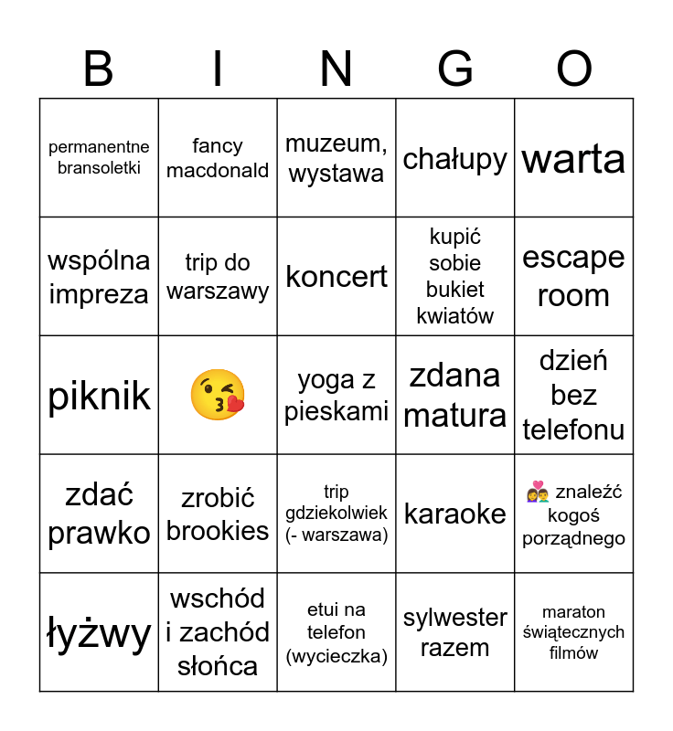 This bingo card has 35 words: Free!, bilard, kino, trip do warszawy, trip gdziekolwiek (- warszawa), chałupy, wspólna impreza, walentynki, koncert, nowy kolczyk, piknik, warta, jezioro, maraton filmowy, permanentne bransoletki, zdana matura, sylwester razem, 😘, zdać prawko, yoga z pieskami, karaoke, łyżwy, 👩❤️👨 znaleźć kogoś porządnego, wschód i zachód słońca, muzeum, wystawa, escape room, maraton świątecznych filmów, fotobudka, kupić sobie bukiet kwiatów, dzień bez telefonu, numer od randoma, etui na telefon (wycieczka), zrobić brookies, fancy macdonald and yes day ✅.