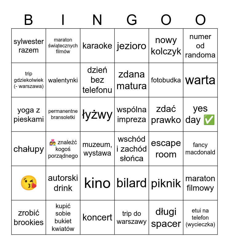 This bingo card has 36 words: bilard, kino, trip do warszawy, trip gdziekolwiek (- warszawa), chałupy, wspólna impreza, walentynki, koncert, nowy kolczyk, piknik, warta, jezioro, maraton filmowy, permanentne bransoletki, zdana matura, sylwester razem, 😘, zdać prawko, yoga z pieskami, karaoke, łyżwy, 👩❤️👨 znaleźć kogoś porządnego, wschód i zachód słońca, muzeum, wystawa, escape room, maraton świątecznych filmów, fotobudka, kupić sobie bukiet kwiatów, dzień bez telefonu, numer od randoma, etui na telefon (wycieczka), zrobić brookies, fancy macdonald, yes day ✅, autorski drink and długi spacer.
