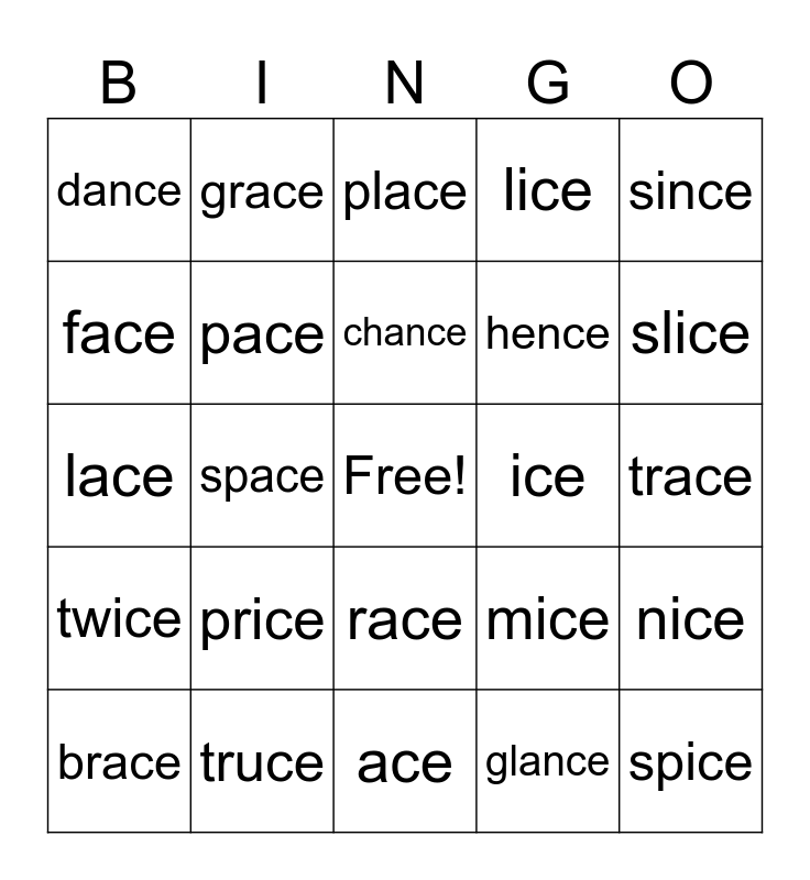This bingo card has a free space and 24 words: price, truce, chance, brace, since, dance, face, grace, ice, race, hence, lace, mice, nice, pace, glance, trace, place, slice, space, spice, twice, lice and ace.