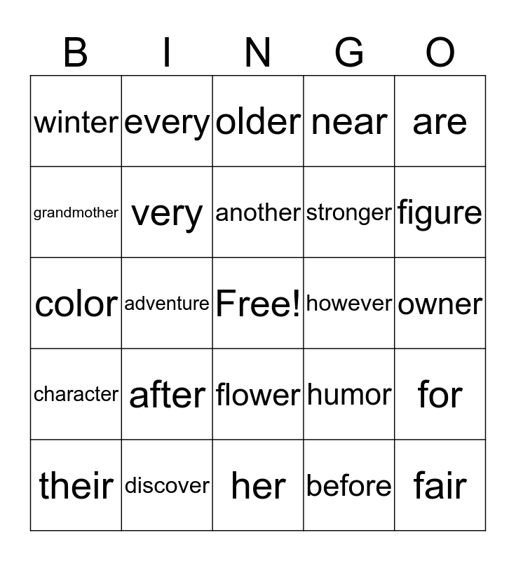 This bingo card has a free space and 24 words: after, discover, another, their, are, winter, grandmother, every, however, flower, stronger, color, humor, for, very, before, owner, older, figure, adventure, fair, character, near and her.