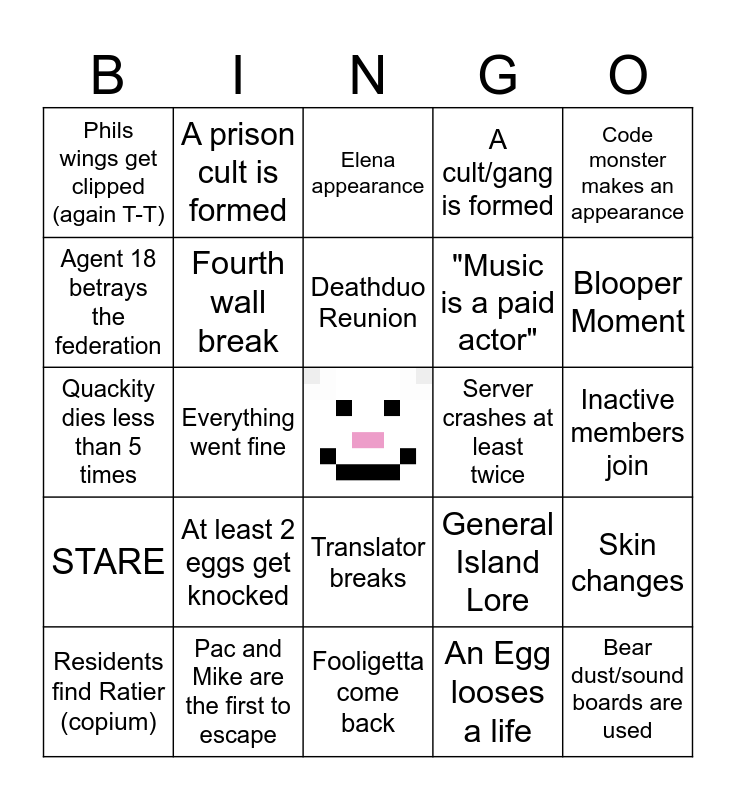 This bingo card has a free space and 24 words: At least 2 eggs get knocked, Pac and Mike are the first to escape, Deathduo Reunion, Residents find Ratier (copium), Code monster makes an appearance, Phils wings get clipped (again T-T), Agent 18 betrays the federation, A prison cult is formed, Server crashes at least twice, Translator breaks, "Music is a paid actor", Quackity dies less than 5 times, General Island Lore, Skin changes, Fourth wall break, An Egg looses a life, Inactive members join, Elena appearance, Blooper Moment, Everything went fine, Bear dust/sound boards are used, STARE, A cult/gang is formed and Fooligetta come back.