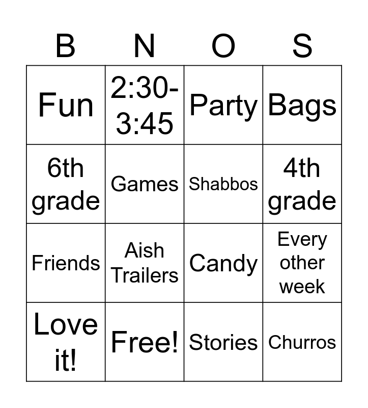 This bingo card has 24 words: Bnos, 3rd grade, 4th grade, 5th grade, 6th grade, Fun, Games, 2:30-3:45, Free!, Events, Friends, Candy, Raffles, Gedolim, Shabbos, Snacks, Stories, Party, Aish Trailers, Every other week, Love it!, Churros, Bags and Sweatshirts.