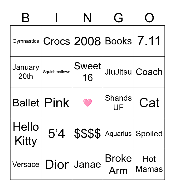 This bingo card has a free space and 24 words: 5’4, Dior, Sweet 16, Versace, 7.11, Gymnastics, January 20th, Crocs, Shands UF, $$$$, JiuJitsu, Ballet, Aquarius, Spoiled, Squishmallows, Broke Arm, Cat, 2008, Coach, Pink, Hot Mamas, Hello Kitty, Books and Janae.