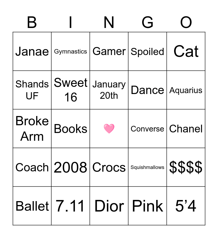This bingo card has a free space and 24 words: 2008, 7.11, January 20th, Ballet, Cat, Janae, Shands UF, Gymnastics, Converse, Crocs, Dance, Broke Arm, Squishmallows, $$$$, Sweet 16, Pink, Chanel, Gamer, Aquarius, Books, 5’4, Coach, Spoiled and Dior.