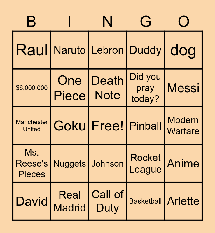 This bingo card has a free space and 31 words: Call of Duty, Gacha Life, Goku, Gojo, Raul, Lebron, One Piece, Rocket League, Pinball, Basketball, Modern Warfare, Arlette, Luis, Soccer, Messi, Starbucks, Anime, Nuggets, Ms. Reese's Pieces, Johnson, dog, Ronaldo, David, Naruto, Did you pray today?, $6,000,000, Duddy, Manchester United, Real Madrid, Death Note and JUJUTSU KAISEN.