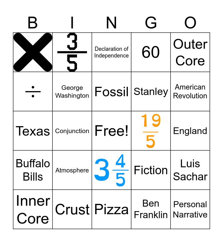 This bingo card has 5 images, a free space and 19 words: Atmosphere, Crust, Fossil, Inner Core, Outer Core, Stanley, Texas, Fiction, Luis Sachar, George Washington, Ben Franklin, England, Declaration of Independence, American Revolution, Conjunction, Personal Narrative, Buffalo Bills, 60 and Pizza.