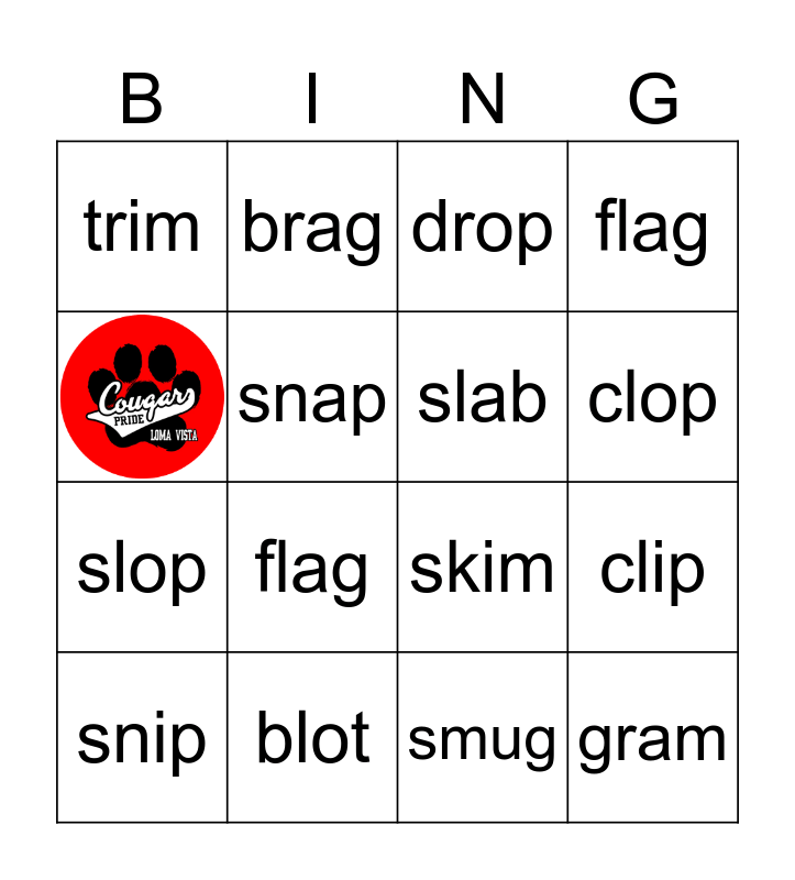 This bingo card has 1 images and 15 words: blot, clip, drop, trim, slop, brag, skim, smug, snap, snip, flag, flag, clop, slab and gram.