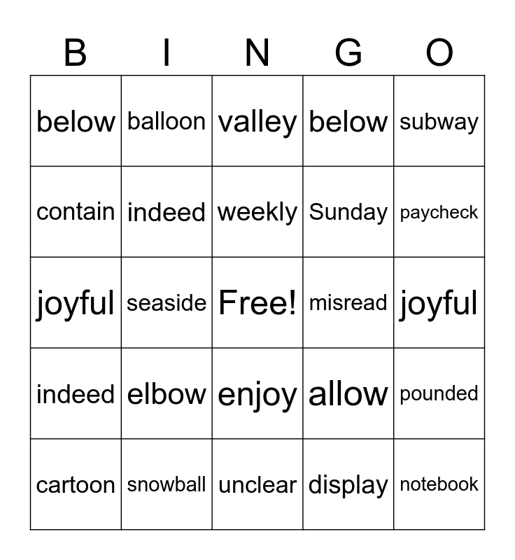 ⚠ This card has duplicate items: amount (2), exclaim (2), mailbox (2), joyful (2), donkey (2), misread (2), pillow (2), subway (2), rainbow (2), walkway (2), weekly (2), Sunday (2), snowshoes (2), follow (2), balloon (2), hockey (2), railroad (2), valley (2), painful (2), below (2), unclear (2), sleepless (2), release (2), cartoon (2), contain (2), soaking (2), classroom (2), paycheck (2), seaside (2), poison (2), anyway (2), pounded (2), enjoy (2), agree (2), shouting (2), coffee (2), notebook (2), remain (2), indeed (2), snowball (2), fainted (2), display (2), freedom (2), seesaw (2), allow (2), discount (2), thirteen (2), monkey (2)