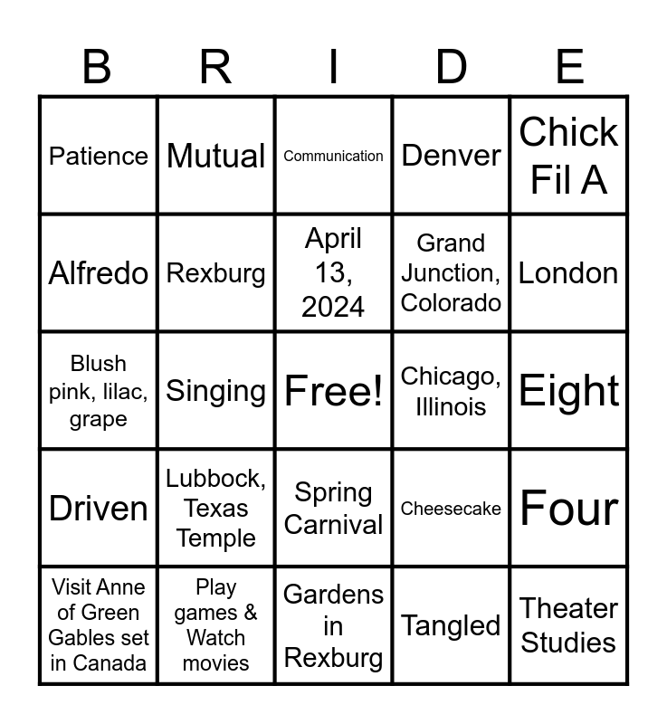 This bingo card has a free space and 26 words: Spring Carnival, Tangled, April 13, 2024, Play games & Watch movies, Chick Fil A, Patience, Alfredo, Mutual, Eight, Cheesecake, Grand Junction, Colorado, Blush pink, lilac, grape, Four, Visit Anne of Green Gables set in Canada, Singing, Pumpkin Anything, Denver, Driven, Communication, Theater Studies, London, Gardens in Rexburg, Chicago, Illinois, Lubbock, Texas Temple, Rexburg and Amarillo, Texas.