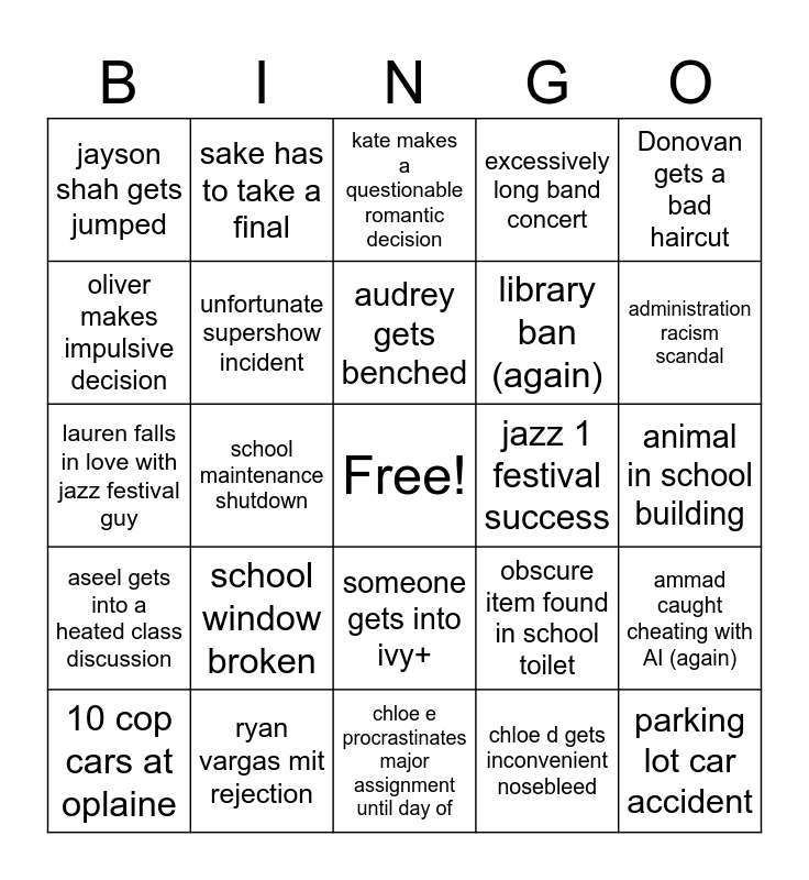 This bingo card has a free space and 24 words: school window broken, ryan vargas mit rejection, audrey gets benched, 10 cop cars at oplaine, Donovan gets a bad haircut, jayson shah gets jumped, oliver makes impulsive decision, sake has to take a final, jazz 1 festival success, someone gets into ivy+, library ban (again), lauren falls in love with jazz festival guy, obscure item found in school toilet, ammad caught cheating with AI (again), unfortunate supershow incident, chloe d gets inconvenient nosebleed, animal in school building, kate makes a questionable romantic decision, administration racism scandal, school maintenance shutdown, parking lot car accident, aseel gets into a heated class discussion, excessively long band concert and chloe e procrastinates major assignment until day of.