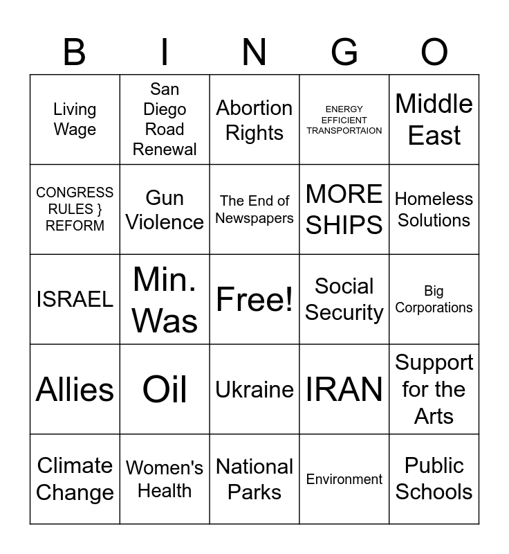 This bingo card has a free space and 29 words: Climate Change, Jobs, Min. Was, Racism, Living Wage, Abortion Rights, Gun Violence, Oil, Social Security, Women's Health, Big Corporations, Public Schools, National Parks, Environment, Homeless Solutions, Imported Illegal Drugs, Ukraine, Allies, Middle East, ISRAEL, IRAN, MILITARY TROOP SUPPORT, MORE SHIPS, CONGRESS RULES } REFORM, ENERGY EFFICIENT TRANSPORTAION, San Diego Road Renewal, Support for the Arts, The End of Newspapers and Price of Medicine.
