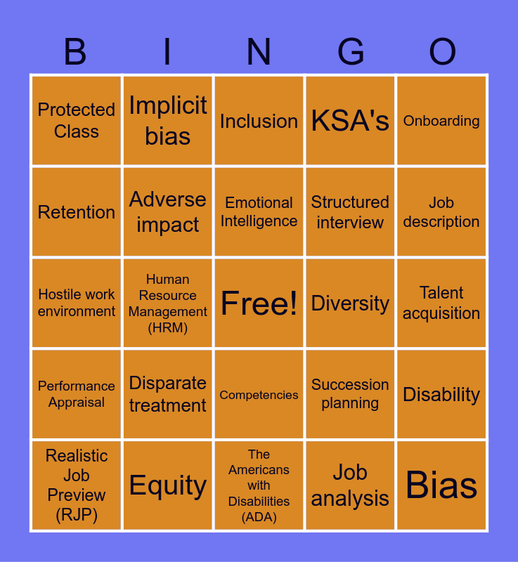 This bingo card has a free space and 30 words: Equity, Turnover rate, Human Resource Management (HRM), Attrition, Protected Class, Inclusion, Adverse impact, Competencies, Diversity, The Americans with Disabilities (ADA), Talent acquisition, Bias, Job analysis, Extrinsic reward, Job description, Organizational change, Succession planning, Performance Appraisal, Disparate treatment, Onboarding, Hostile work environment, Essential job functions, Implicit bias, Structured interview, Retention, KSA's, Disability, Realistic Job Preview (RJP), Emotional Intelligence and Harassment.