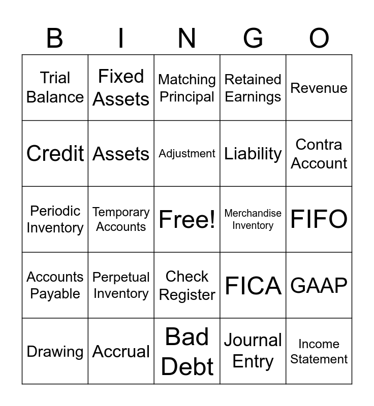 This bingo card has a free space and 59 words: Accounts Receivable, Accrual, General Ledger, Accounts Payable, Journal Entry, Balance Sheet, Assets, Closing Entry, Liability, Debit, Retained Earnings, Capital, Credit, Post, Footing, Trial Balance, Income Statement, Revenue, Expense, Adjustment, Merchandise Inventory, Matching Principal, Drawing, GAAP, Chart of Accounts, T Account, Unearned Revenue, Source Document, Contra Account, Fiscal Year, Prepaid Expense, Depreciation, Accumulated Depreciation, Unadjusted Trial balance, Fixed Assets, Income Summary, Permanent Accounts, Temporary Accounts, Worksheet, Periodic Inventory, Multi Step Income Statement, Perpetual Inventory, FIFO, LIFO, Gross Profit, Subsidiary Ledger, Controlling Account, Accounts Receivable Ledger, Check Register, Bad Debt, Allowance for Doubtful Accounts, Direct Write Off, Aging of Accounts Receivable, Promissory Note, W-2, FICA, Net Pay, Unemployment Tax and Cost of Goods Sold.
