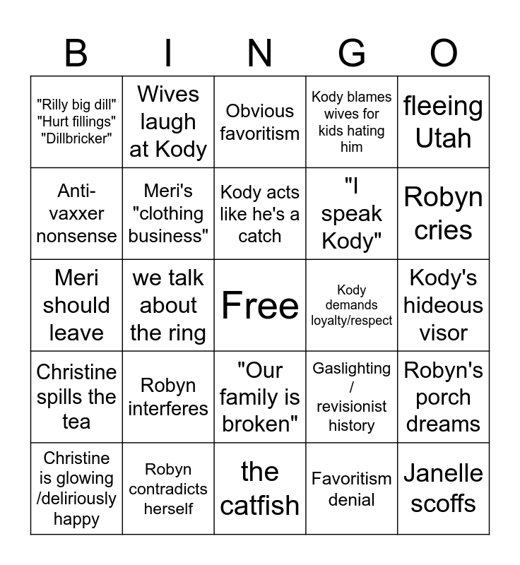 This bingo card has a free space and 39 words: Kody neglects older kids, Someone overshares, Older kids shade Kody, Meri's "clothing business", Christine is glowing /deliriously happy, "Our family is broken", Kody acts like he's a catch, the barndominium, fleeing Utah, Christine spills the tea, we talk about the ring, Kody blames wives for kids hating him, Janelle scoffs, Kody's hideous visor, Kody demands loyalty/respect, Robyn interferes, Janelle spits facts, "Rilly big dill" "Hurt fillings" "Dillbricker", Meri Grey rocks, Gaslighting / revisionist history, Anti-vaxxer nonsense, the catfish, "I speak Kody", Robyn cries, Knife in the kidneys, Someone mad about Christmas, "Sacred covenant", Kody's heinous sunglasses, Kody & Robyn pretend they're happy for former wives, Wives laugh at Kody, "A new beginning", Christine & Janelle being besties, Obvious favoritism, Robyn contradicts herself, Favoritism denial, Sacred lonliness, Robyn's porch dreams, Meri should leave and Kody flips noodle hair.