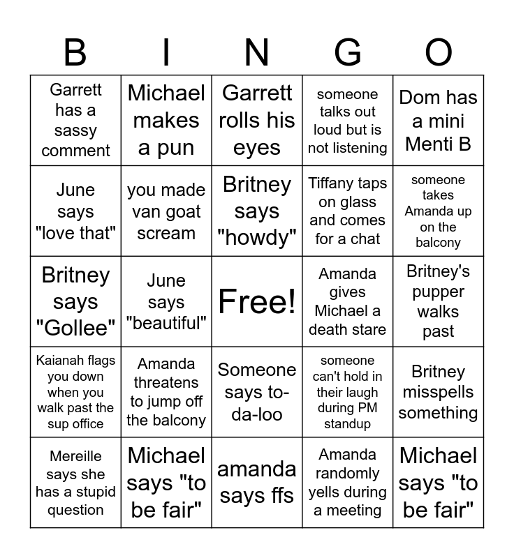 This bingo card has a free space and 24 words: Amanda threatens to jump off the balcony, Michael says "to be fair", Britney says "howdy", Mereille says she has a stupid question, Dom has a mini Menti B, Garrett has a sassy comment, June says "love that", Michael makes a pun, Amanda gives Michael a death stare, Someone says to-da-loo, Tiffany taps on glass and comes for a chat, Britney says "Gollee", someone can't hold in their laugh during PM standup, Britney misspells something, you made van goat scream, Amanda randomly yells during a meeting, Britney's pupper walks past, Garrett rolls his eyes, someone takes Amanda up on the balcony, June says "beautiful", Michael says "to be fair", Kaianah flags you down when you walk past the sup office, someone talks out loud but is not listening and amanda says ffs.