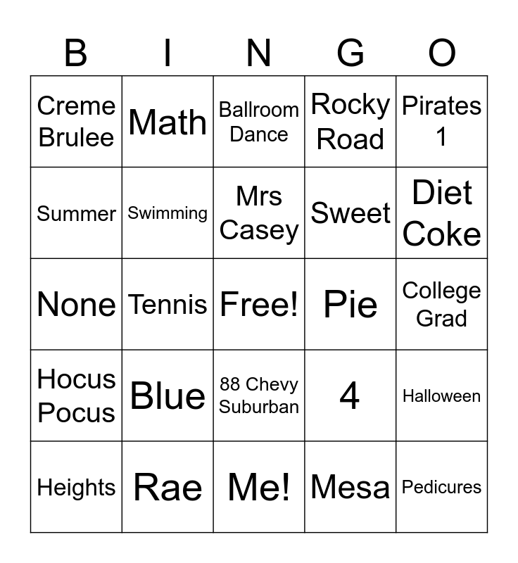 This bingo card has a free space and 24 words: Blue, Rae, Mrs Casey, Heights, Pirates 1, Creme Brulee, Summer, Math, Pie, 88 Chevy Suburban, Sweet, None, 4, Halloween, Swimming, Mesa, College Grad, Ballroom Dance, Diet Coke, Tennis, Pedicures, Hocus Pocus, Rocky Road and Me!.