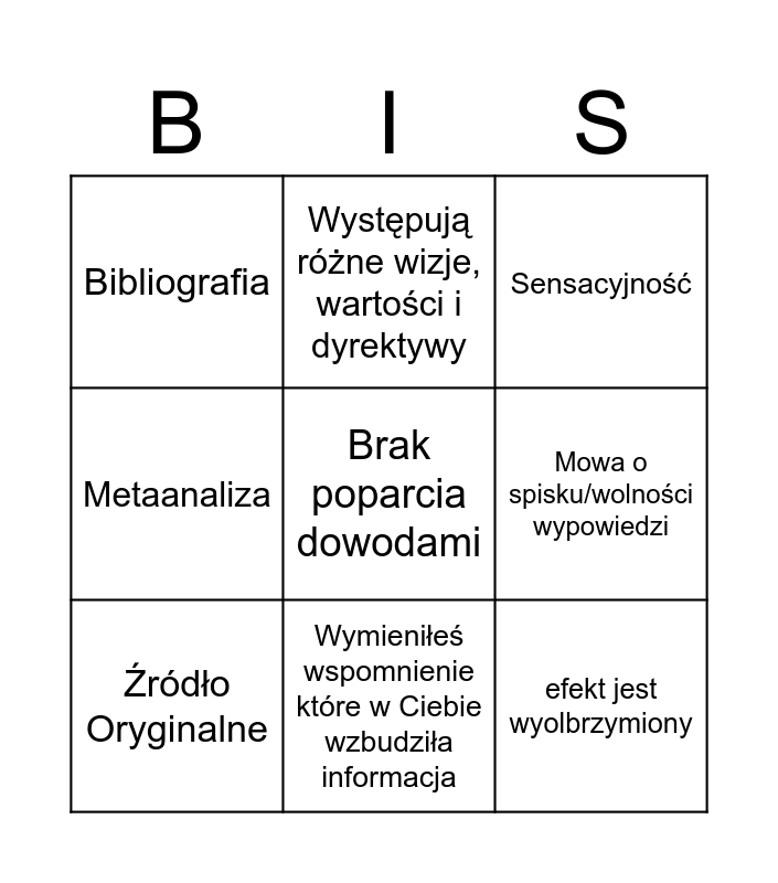 This bingo card has 22 words: Brak Źródeł, Inna perspektywa mówi co innego, Sensacyjność, Pojedyncze Źródło, Brak poparcia dowodami, Nie chciałeś się tego dowiedzieć, Bibliografia, Występują różne wizje, wartości i dyrektywy, Informacja nie była łatwo dostępna, Wiadomość, Wymieniłeś wspomnienie które w Ciebie wzbudziła informacja, Mowa o spisku/wolności wypowiedzi, Artykuł, Jesteś w stanie od początku określić stanowisko autora, Nie wpływa to na bogatych lub wpływowych ludzi, Przegląd, Wymyśliłeś informacje która zmieniłaby Twoje zdanie, Teoria kuleje w fundamentalnych naukach, Źródło Oryginalne, efekt jest wyolbrzymiony, Metaanaliza and Mowa o przetrwaniu lub o czymś popularnym.