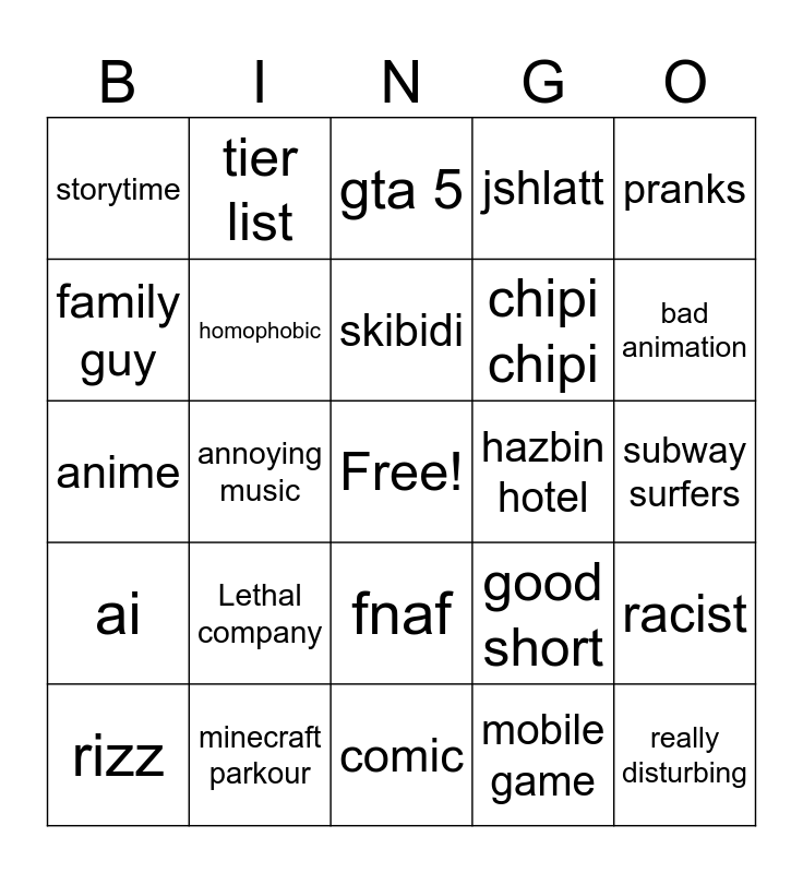 This bingo card has a free space and 24 words: Lethal company, minecraft parkour, skibidi, rizz, pranks, storytime, family guy, tier list, hazbin hotel, fnaf, chipi chipi, anime, good short, racist, homophobic, mobile game, subway surfers, gta 5, bad animation, annoying music, really disturbing, ai, jshlatt and comic.