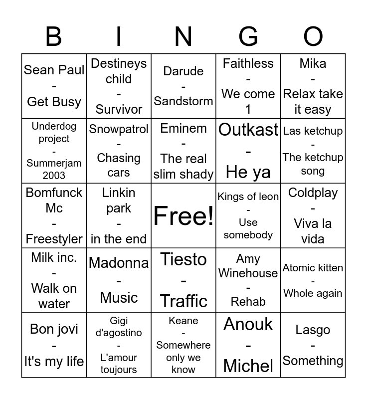 This bingo card has a free space and 24 words: Madonna - Music, Gigi d'agostino - L'amour toujours, Eminem - The real slim shady, Bon jovi - It's my life, Mika - Relax take it easy, Sean Paul - Get Busy, Underdog project - Summerjam 2003, Destineys child - Survivor, Kings of leon - Use somebody, Tiesto - Traffic, Outkast - He ya, Bomfunck Mc - Freestyler, Amy Winehouse - Rehab, Atomic kitten - Whole again, Snowpatrol - Chasing cars, Anouk - Michel, Coldplay - Viva la vida, Darude - Sandstorm, Las ketchup - The ketchup song, Linkin park - in the end, Lasgo - Something, Milk inc. - Walk on water, Faithless - We come 1 and Keane - Somewhere only we know.