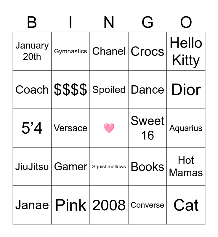 This bingo card has a free space and 24 words: Gamer, Pink, Spoiled, Janae, Hello Kitty, January 20th, Coach, Gymnastics, Sweet 16, Squishmallows, Dance, 5’4, Books, Hot Mamas, $$$$, Converse, Aquarius, Chanel, Dior, Versace, Cat, JiuJitsu, Crocs and 2008.