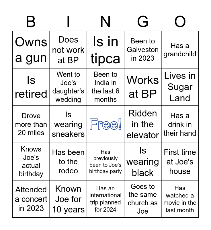 This bingo card has a free space and 24 words: Has been to the rodeo, Known Joe for 10 years, Been to India in the last 6 months, Attended a concert in 2023, Has a grandchild, Owns a gun, Is retired, Does not work at BP, Ridden in the elevator, Has previously been to Joe's birthday party, Works at BP, Drove more than 20 miles, Is wearing black, First time at Joe's house, Went to Joe's daughter's wedding, Goes to the same church as Joe, Has a drink in their hand, Is in tipca, Lives in Sugar Land, Is wearing sneakers, Has watched a movie in the last month, Knows Joe's actual birthday, Been to Galveston in 2023 and Has an international trip planned for 2024.