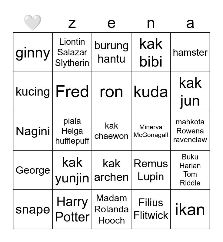 This bingo card has a free space and 24 words: kak yunjin, Harry Potter, ron, snape, hamster, ginny, kucing, Liontin Salazar Slytherin, Minerva McGonagall, kak archen, kuda, Nagini, Remus Lupin, Buku Harian Tom Riddle, Fred, Filius Flitwick, mahkota Rowena ravenclaw, burung hantu, kak jun, piala Helga hufflepuff, ikan, George, kak bibi and Madam Rolanda Hooch.