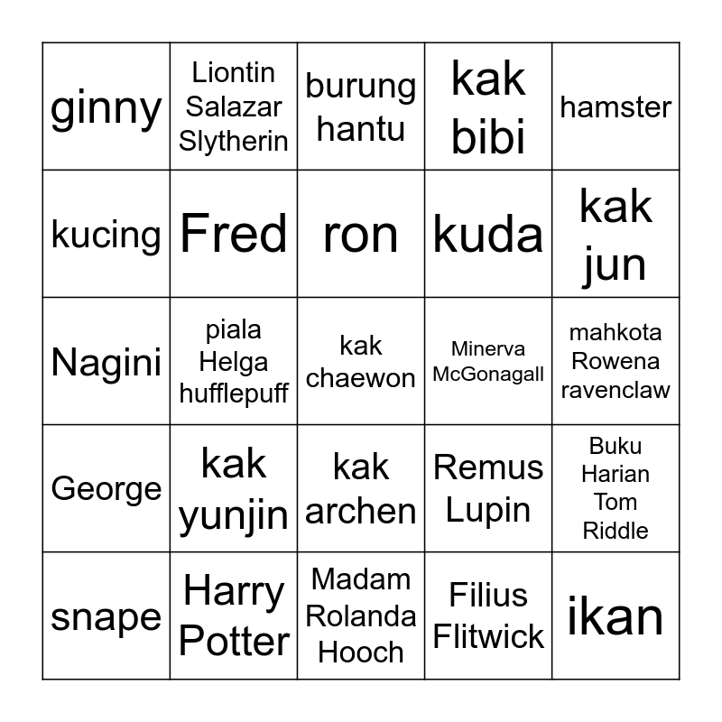 This bingo card has a free space and 24 words: kak yunjin, Harry Potter, ron, snape, hamster, ginny, kucing, Liontin Salazar Slytherin, Minerva McGonagall, kak archen, kuda, Nagini, Remus Lupin, Buku Harian Tom Riddle, Fred, Filius Flitwick, mahkota Rowena ravenclaw, burung hantu, kak jun, piala Helga hufflepuff, ikan, George, kak bibi and Madam Rolanda Hooch.