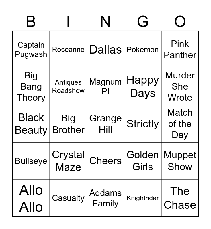 This bingo card has a free space and 29 words: Allo Allo, Cricket, Big Brother, BLOCKBUSTERS, Captain Pugwash, Dallas, Antiques Roadshow, Crystal Maze, Strictly, Casualty, Match of the Day, The Chase, Addams Family, Knightrider, Murder She Wrote, Fresh Prince, Cheers, Bullseye, Pink Panther, Black Beauty, Golden Girls, Friends, Happy Days, Big Bang Theory, Pokemon, Roseanne, Muppet Show, Magnum PI and Buffy.
