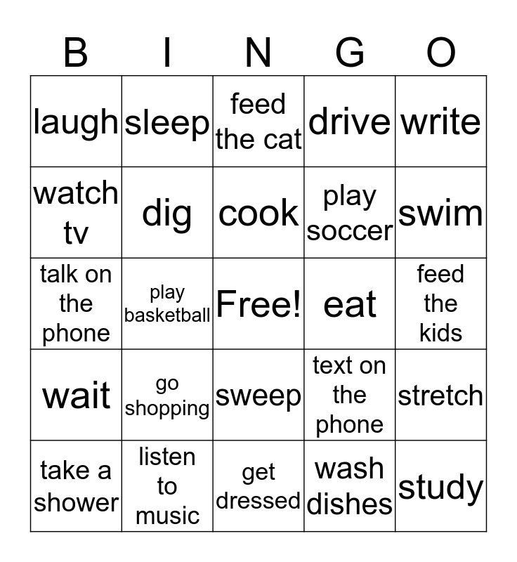 This bingo card has a free space and 24 words: go shopping, listen to music, cook, take a shower, write, laugh, watch tv, sleep, eat, sweep, play soccer, talk on the phone, text on the phone, stretch, dig, wash dishes, feed the kids, feed the cat, swim, play basketball, study, wait, drive and get dressed.