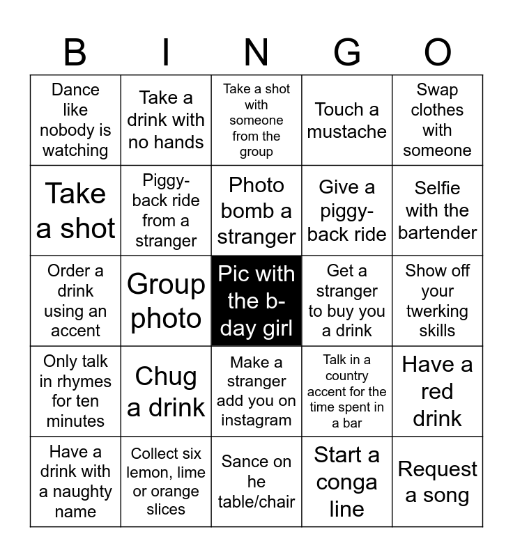This bingo card has a free space and 24 words: Chug a drink, Collect six lemon, lime or orange slices, Photo bomb a stranger, Have a drink with a naughty name, Swap clothes with someone, Dance like nobody is watching, Take a shot, Take a drink with no hands, Get a stranger to buy you a drink, Make a stranger add you on instagram, Give a piggy-back ride, Order a drink using an accent, Talk in a country accent for the time spent in a bar, Have a red drink, Piggy-back ride from a stranger, Start a conga line, Show off your twerking skills, Take a shot with someone from the group, Selfie with the bartender, Group photo, Request a song, Only talk in rhymes for ten minutes, Touch a mustache and Sance on he table/chair.