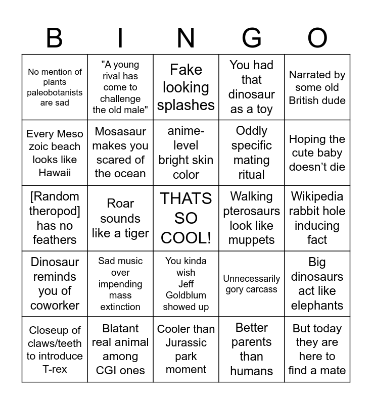 This bingo card has a free space and 24 words: Sad music over impending mass extinction, Blatant real animal among CGI ones, anime-level bright skin color, Closeup of claws/teeth to introduce T-rex, Narrated by some old British dude, No mention of plants paleobotanists are sad, Every Meso zoic beach looks like Hawaii, "A young rival has come to challenge the old male", Walking pterosaurs look like muppets, You kinda wish Jeff Goldblum showed up, Oddly specific mating ritual, [Random theropod] has no feathers, Unnecessarily gory carcass, Big dinosaurs act like elephants, Mosasaur makes you scared of the ocean, Better parents than humans, Wikipedia rabbit hole inducing fact, Fake looking splashes, Hoping the cute baby doesn’t die, Roar sounds like a tiger, But today they are here to find a mate, Dinosaur reminds you of coworker, You had that dinosaur as a toy and Cooler than Jurassic park moment.