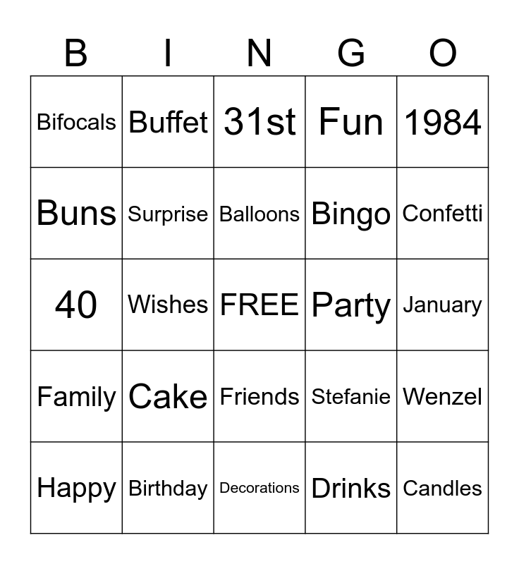 This bingo card has a free space and 24 words: Cake, Birthday, Balloons, Happy, 1984, Bifocals, Buns, Buffet, Party, Friends, Bingo, 40, Stefanie, Wenzel, Surprise, Drinks, January, 31st, Confetti, Wishes, Candles, Family, Fun and Decorations.
