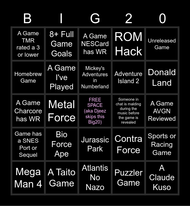 This bingo card has a free space and 24 words: Bio Force Ape, A Taito Game, Mickey's Adventures in Numberland, Mega Man 4, Unreleased Game, A Game TMR rated a 3 or lower, Homebrew Game, 8+ Full Game Goals, Someone in chat is malding during the music before the game is revealed, Jurassic Park, Adventure Island 2, A Game Charcore has WR, Contra Force, Sports or Racing Game, A Game I've Played, Puzzler Game, A Game AVGN Reviewed, A Game NESCard has WR, Donald Land, Metal Force, A Claude Kuso, Game has a SNES Port or Sequel, ROM Hack and Atlantis No Nazo.