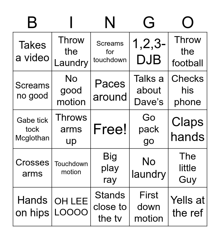 This bingo card has a free space and 24 words: Touchdown motion, OH LEE LOOOO, Paces around, Hands on hips, Throw the football, Takes a video, Screams no good, Throw the Laundry, Go pack go, Big play ray, Talks a about Dave’s, Gabe tick tock Mcglothan, No laundry, The little Guy, No good motion, First down motion, Claps hands, Screams for touchdown, Checks his phone, Throws arms up, Yells at the ref, Crosses arms, 1,2,3-DJB and Stands close to the tv.