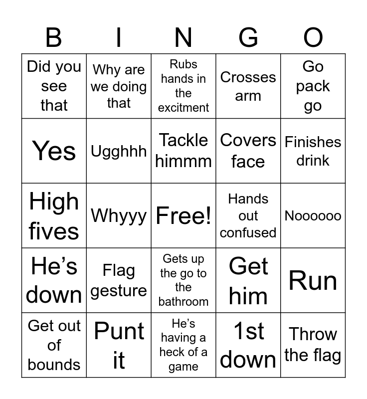This bingo card has a free space and 24 words: Flag gesture, Punt it, Tackle himmm, Get out of bounds, Go pack go, Did you see that, Yes, Why are we doing that, Hands out confused, Gets up the go to the bathroom, Covers face, High fives, Get him, Run, Ugghhh, 1st down, Noooooo, Rubs hands in the excitment, Finishes drink, Whyyy, Throw the flag, He’s down, Crosses arm and He’s having a heck of a game.